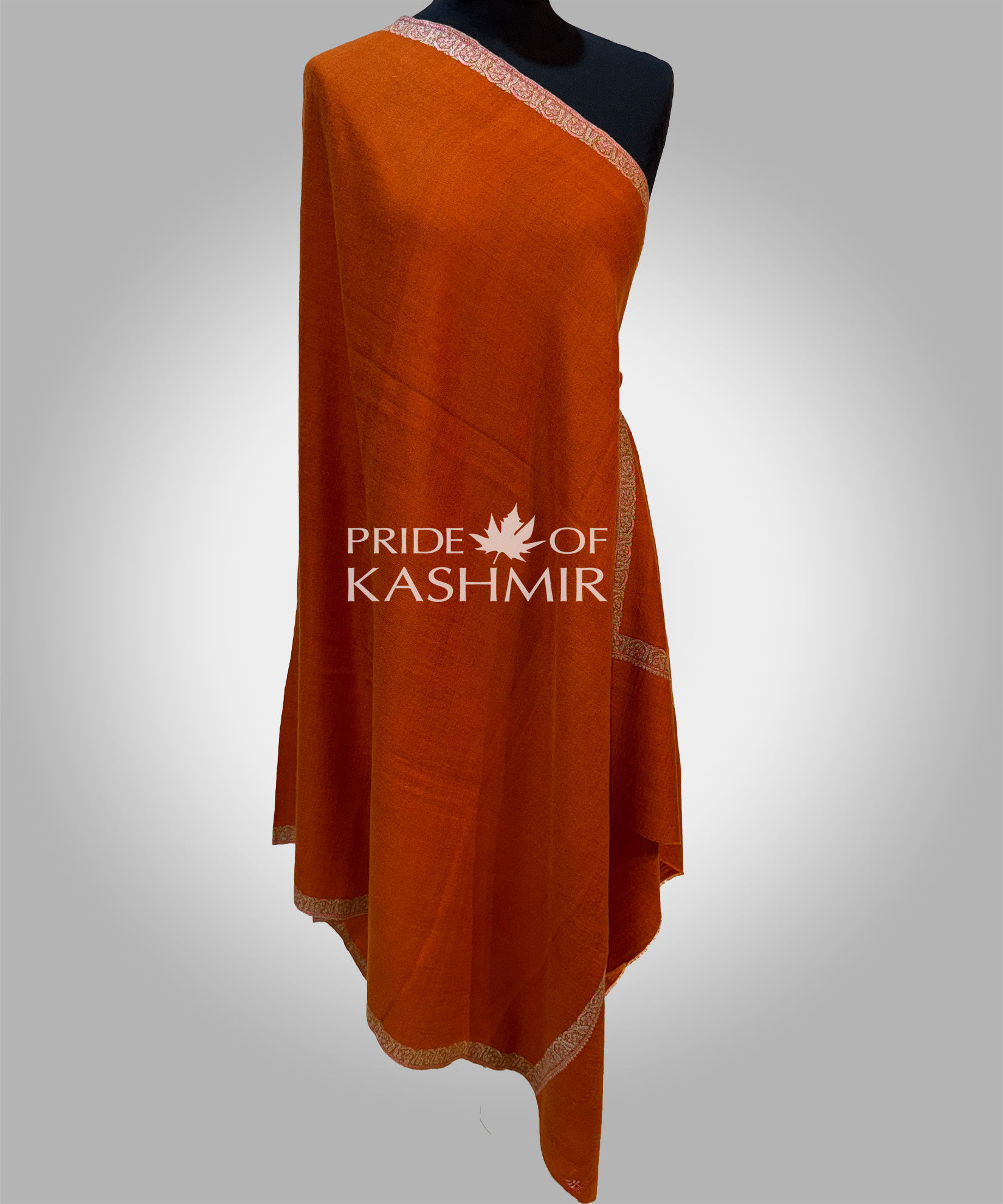 Radiant as a Kashmir sunset, this vibrant burnt‑orange shawl commands attention while maintaining classic grace. A tonal woven border frames the piece, making it a striking statement against neutral or dark wardrobes.Craft:Hand‑woven Pashmina highlighted by a subtly textured small border.