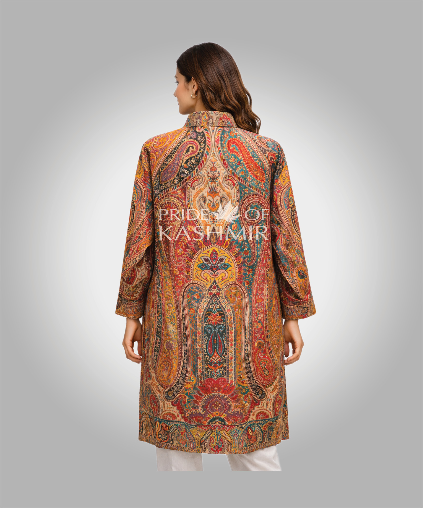 Echoing the rich tones of autumn leaves, this jacket carries a tapestry of earthy hues woven into intricate Kani patterns. Warm and expressive, it reflects the changing seasons while preserving the legacy of Kashmiri artistry.
