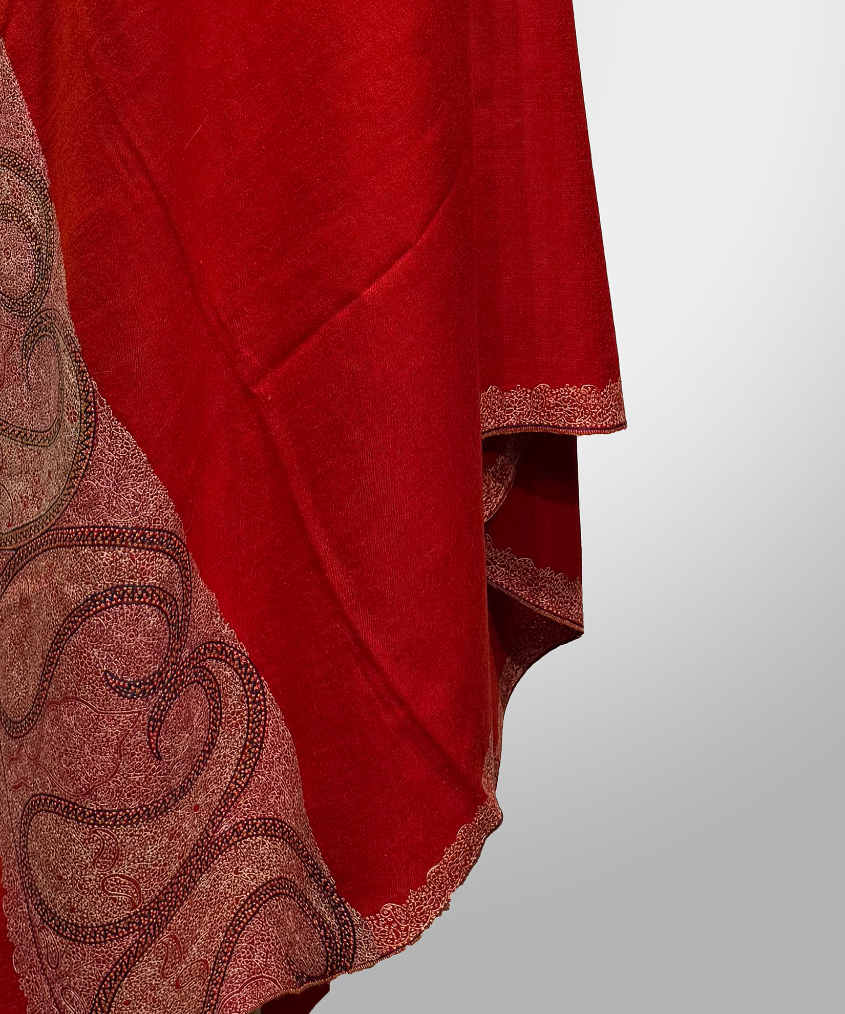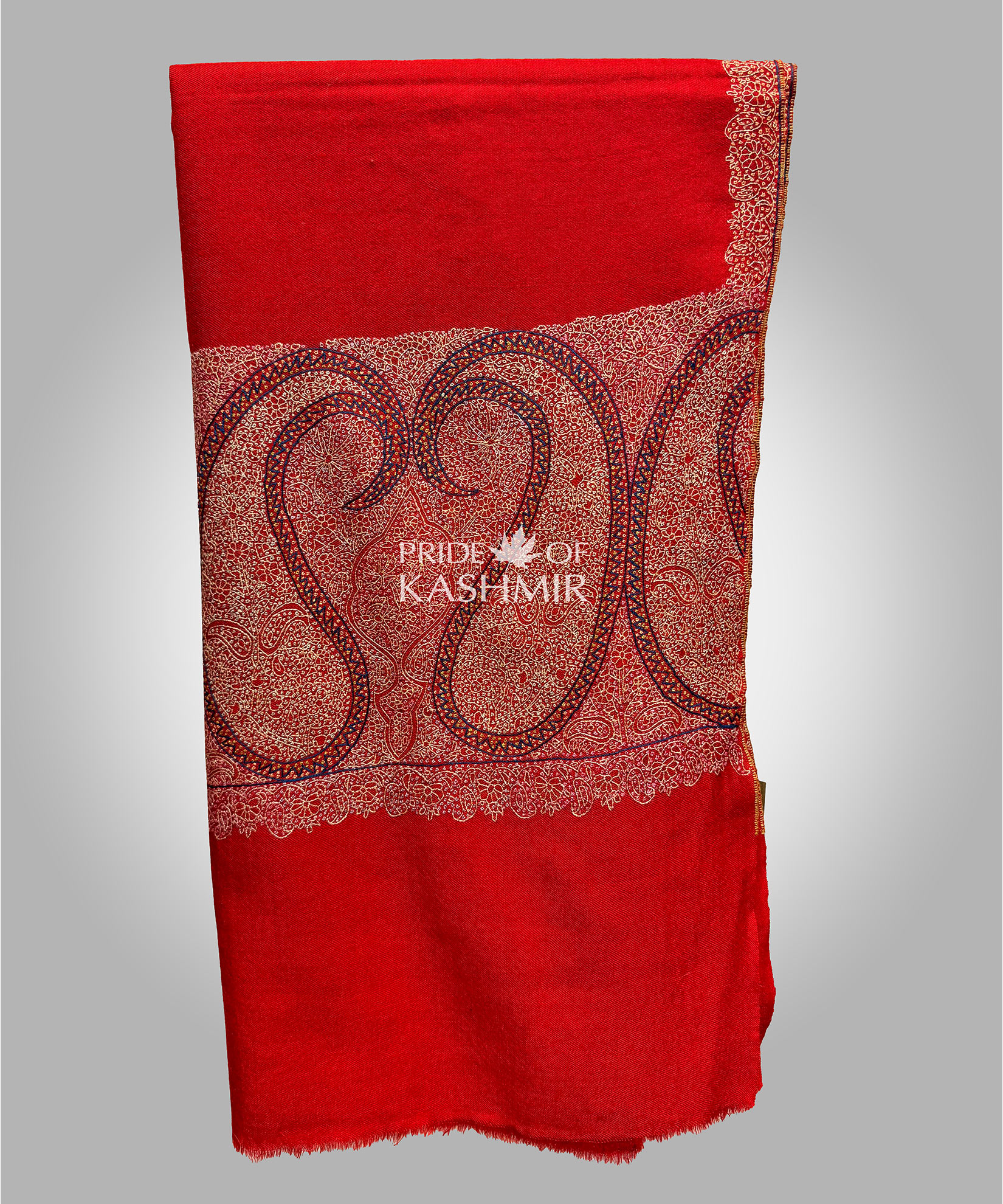 Intricate Sozni embroidery in gold and colourful threads on the borders decorates this regal red shawl, making it a standout piece for formal occasions.