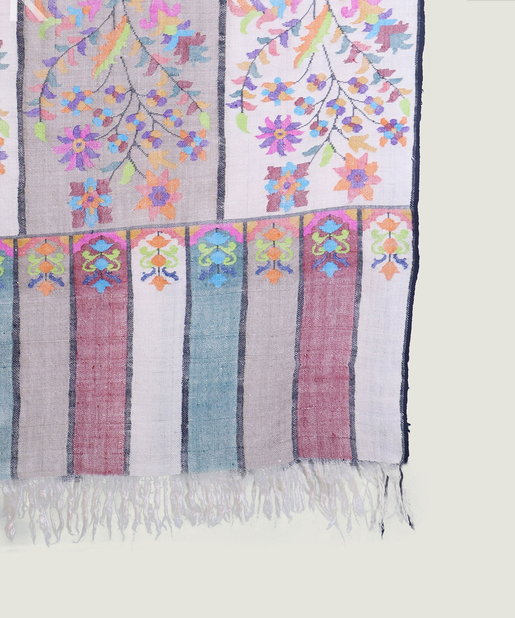 Capturing the essence of a fresh morning, this shawl features soothing tones and intricate handwoven designs that exude charm and elegance..Craft:Handwoven featuring intricate designs featuring motifs like flowers, paisleys, vines, and geometric patterns using Kanis (wooden bobbins)