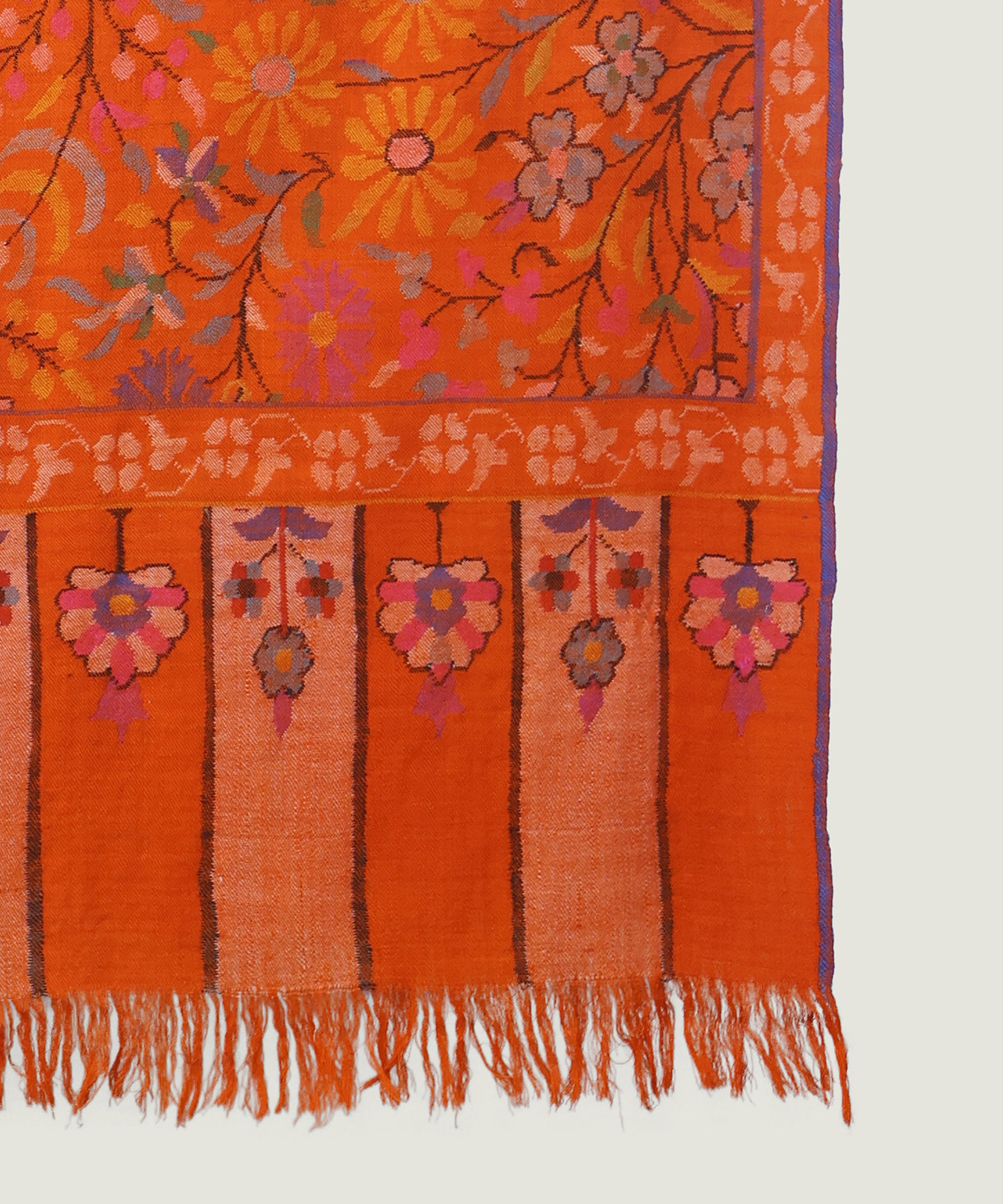 This shawl illuminates any ensemble with its soft, radiant tones. Intricate Sozni embroidery and handwoven craftsmanship make it an elegant choice for any occasion..Craft: Handwoven featuring intricate designs featuring motifs like flowers, paisleys, vines, and geometric patterns using Kanis (wooden bobbins)