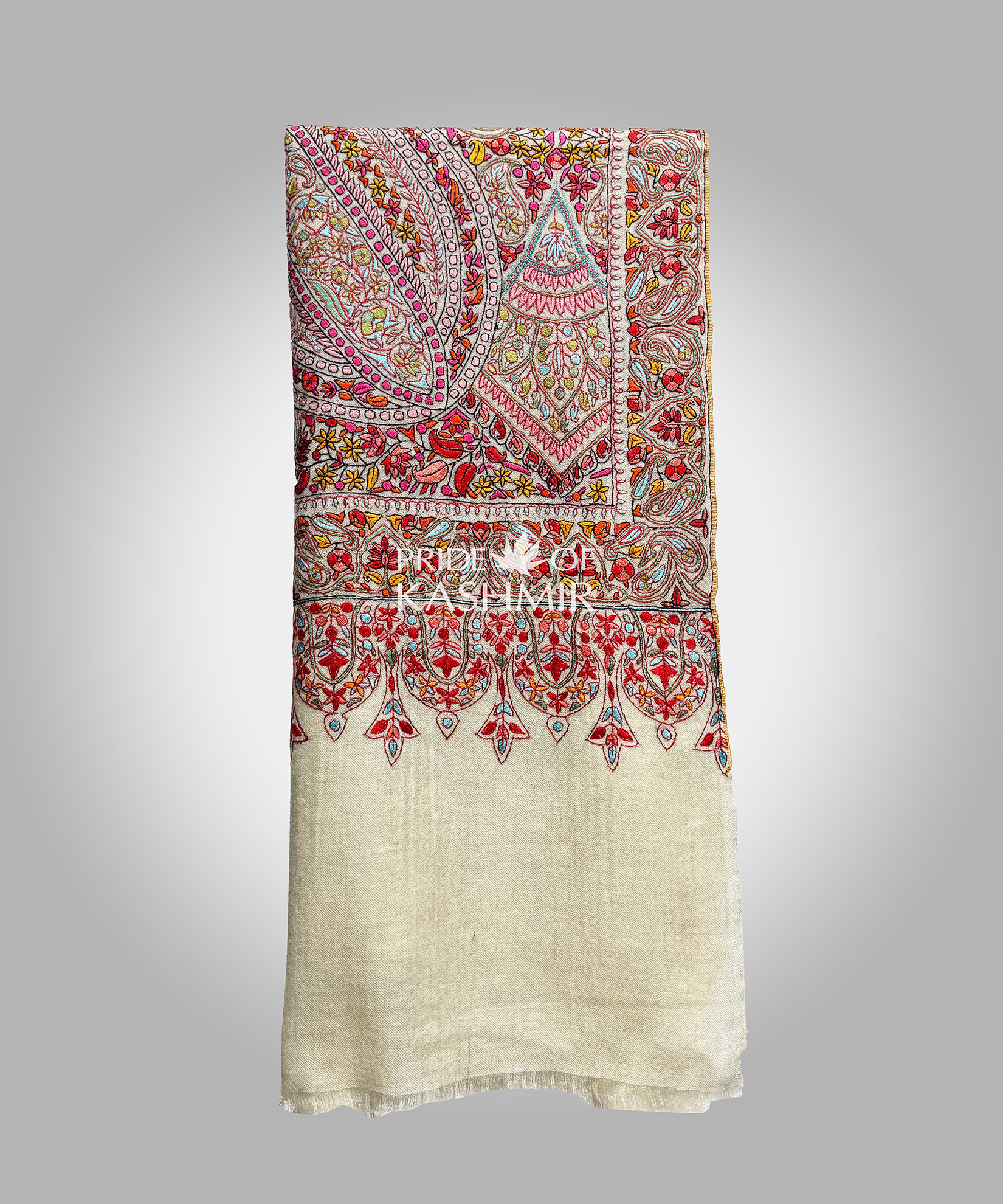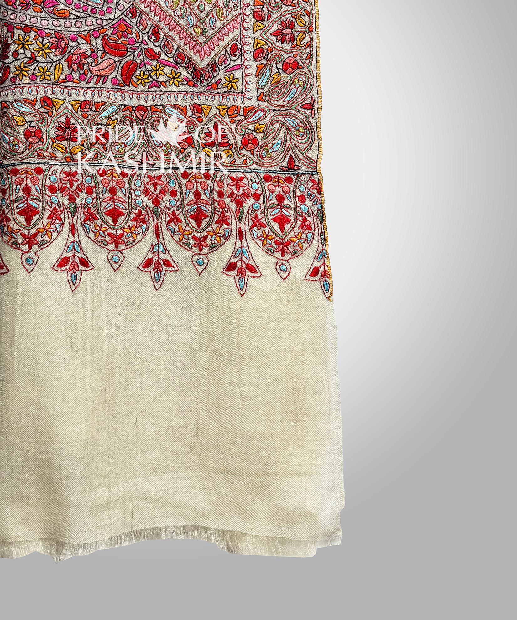 A vibrant blend of all hues of intricate Sozni embroidery forms the striking pattern of this Paisley Pashmina shawl. Its contemporary design is balanced by the rich heritage of Kashmiri intricate Sozni embroidery.Craft:Handwoven with Intricate colourful Sozni embroidery