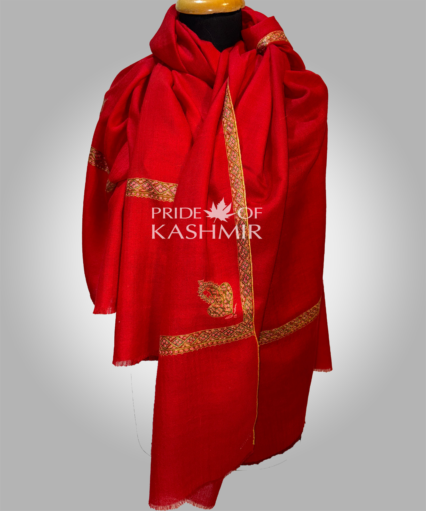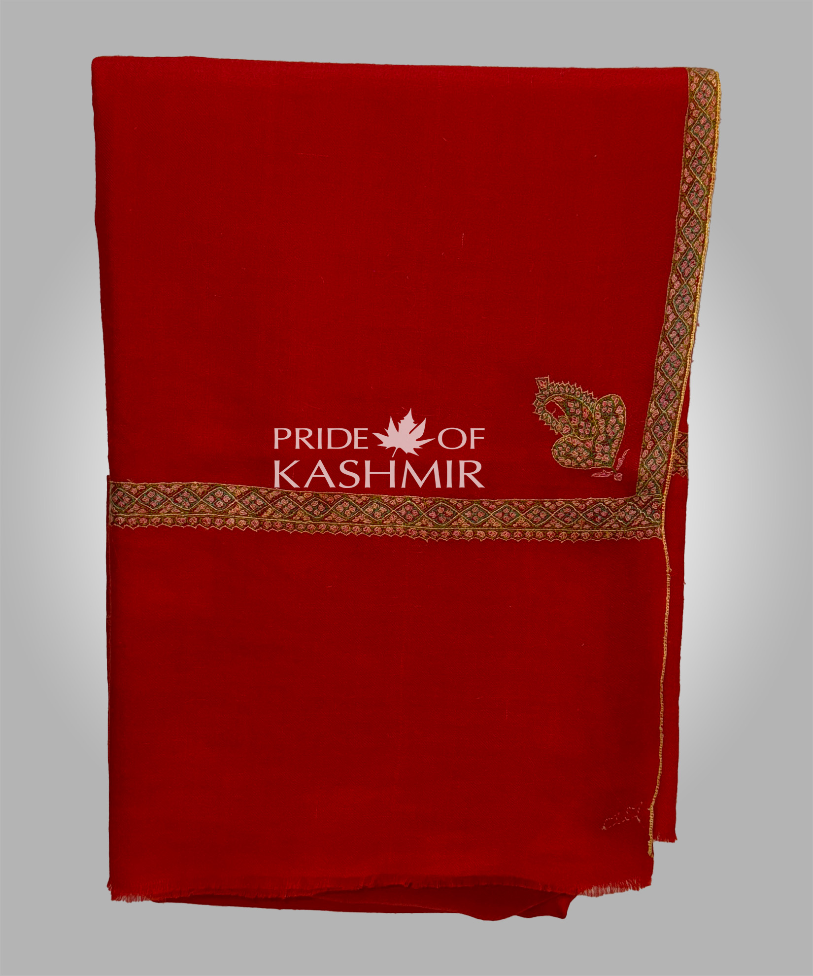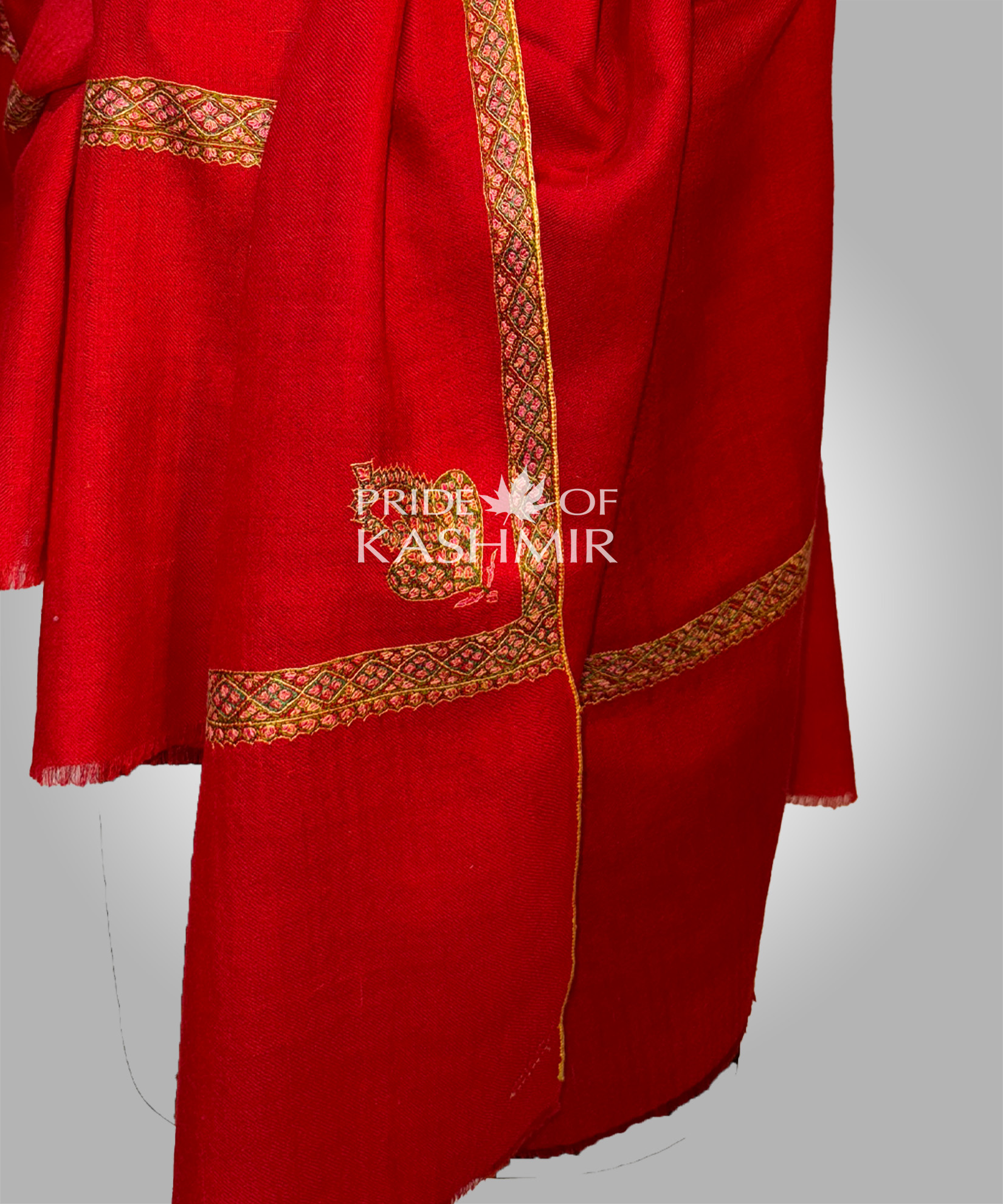A striking red shawl with a fine, discreet border — perfect as a ceremonial or festive wrap that doesn't overpower.Craft:Subtle border embroidery on hand woven Pashmina.