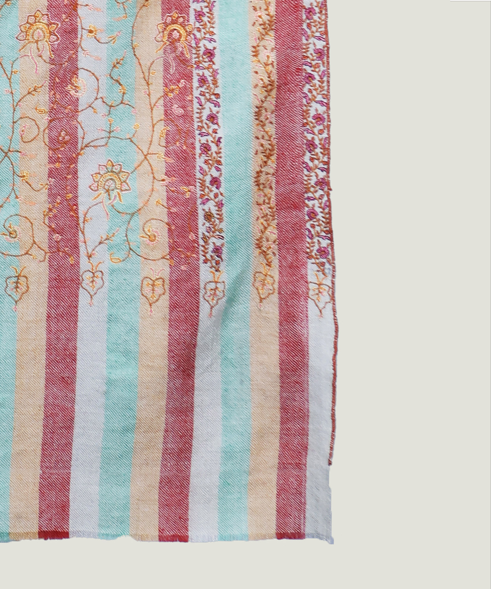 Symmetrically arranged rainbow hue stripes on a natural pashmina base make this shawl a statement of timeless elegance. Each intricate detail is handwoven with precision, showcasing masterful craftsmanship...Craft: Handwoven