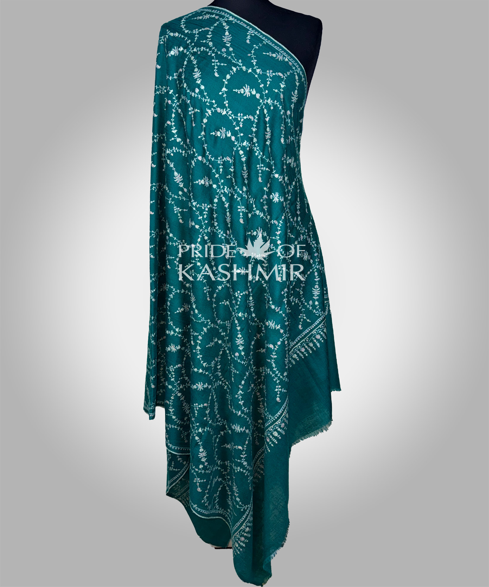 This moody yet refined shawl features intricate floral Jal embroidery over a forest green base, like blossoms under a dusky sky.Craft:All-over hand embroidery in Jal design by Kashmiri artisans.