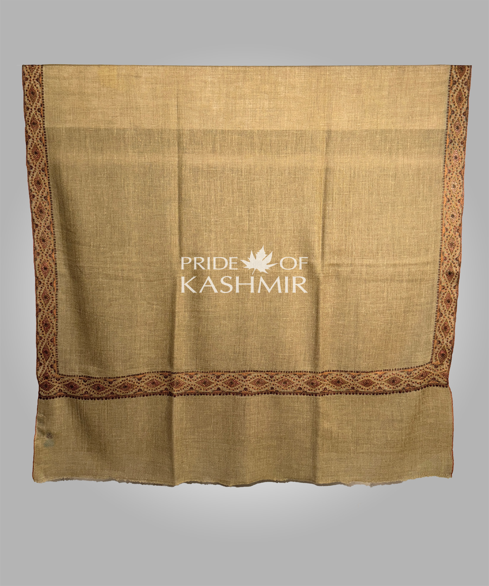 A dramatic union of light brown tones and bold craftsmanship, this big border Pashmina is crafted to command attention. Perfect for winter soirées and ceremonial gatherings.Craft:Handloomed Pashmina with regal borders.